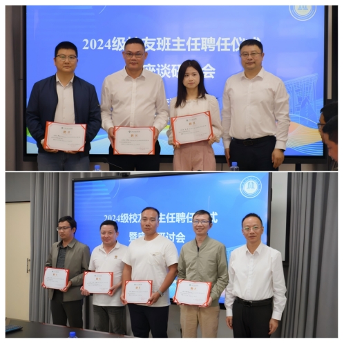 在大学城校区实验二号楼502会议室举行2024级校友班主任聘任仪式暨座谈研讨会。学院党委书记周建强、学院院长赵志伟、学院党委副书记陈颂坚、2024级校友班主任、校内班主任、辅导员等参加活动,活动由学院校友办主任曾阅主持。