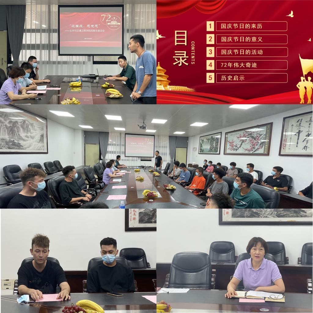 这个大家庭,鼓励大家尽快适应大学学习和生活,向优秀的师兄师姐们学习,立志四年后成为优秀的广工大毕业生。接着,她结合党史学习教育做了“迎国庆,感党恩”的主题分享, 并鼓励大家做民族团结的践行者、捍卫者、传播者,要撸起袖子加油干,学好专业本领,努力做好大美新疆和美丽中国的建设者,为实现党的第二个百年奋斗目标和中华民族伟大复兴的中国梦贡献新的更大青春力量。