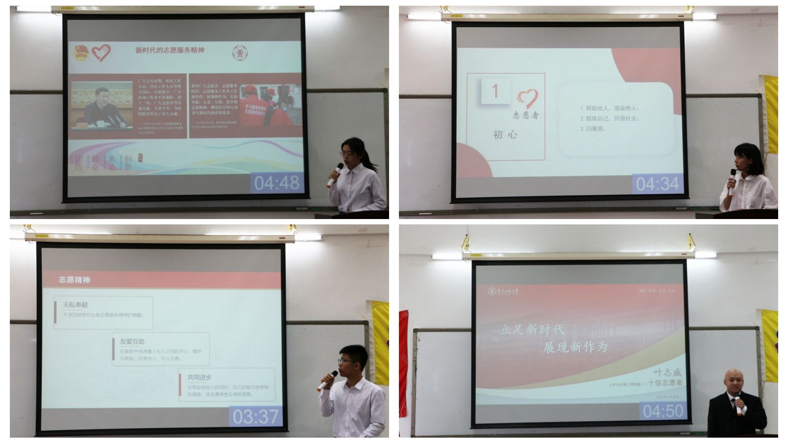 在主持人简单地介绍评分规则后,评选答辩正式开始。“青年责,教育心,公益情。”叶志威同学将其志愿经历与收获凝练为短短九字,表达了自己对志愿精神的深刻理解。“雷锋精神,人人可学;奉献爱心,处处可为。”丁美跃同学表示,我们应学习为人民服务的意识,并将其践行到实际生活中来。“当一位拿着火车票的老人向我询问如何坐地铁时,我深刻感受到了这就是我们志愿者存在的意义。”林子富同学声情并茂的发言,让我们更加深刻感受到:志愿服务就在身边。志愿者们用生动的语言讲述了他们对志愿精神的理解和感悟,带领我们走进属于他们的志愿服务故事。