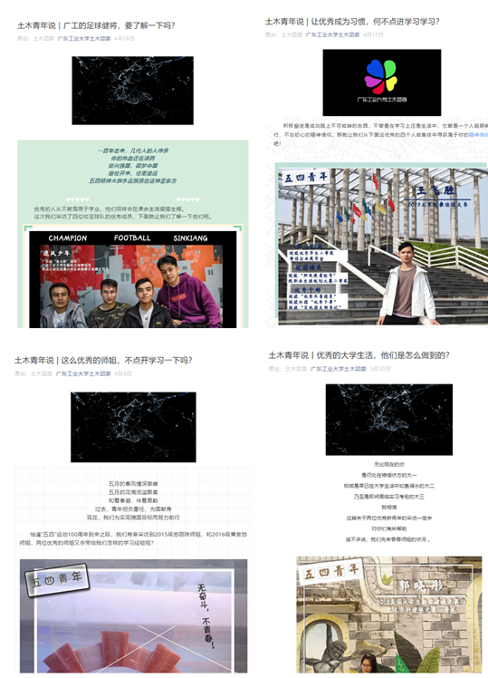 ——我院开展纪念五四运动一百周年系列活动 今年是五四运动一百周年、新中国成立七十周年,为激励和引领学生传承五四精神,大力弘扬以爱国主义为核心的民族精神,我院团委积极响应校团委号召,在五四青年节前后开展了内容丰富、形式多样的系列纪念活动,引导青年学生弘扬五四精神,争做时代先锋。 学习五四精神,争当优秀青年 3月30日至4月18日期间,学院团委推出4篇“土木·青年说——五四精神,传承有我”人物采访推文,阅读量近2000人次。通过视频加推文的传播形式分享优秀同伴如何学习、如何平衡各方面、如何理解与传承五四精神等问题的经验看法,营造向上氛围,推动共同进步。 学习党团知识,坚定理想信念 4月26日晚,学院团委在大学城校区教学楼举办以“我和我的祖国”为主题的党团知识竞赛,本次竞赛有26支队伍,共计72位同学参赛。本次比赛通过笔试选拔晋级复赛的队伍,复赛通过队伍之间两两抢答的形式进行。比赛期间,选手们积极参与抢答,其中,“牌坊街队”一路高歌,以丰富的知识储备和快速反应一路过关斩将,荣获冠军,他们的答题表现更是博得了观众们的阵阵掌声。 弘扬五四精神,奉献火热青春 4月22日至5月3日期间,学院团委举办了以“弘扬五四精神,奉献火热青春”为主题的征文比赛和以“青春随手拍”为主题的表情包、视频、照片征集比赛,鼓励学生主动学习并感悟五四精神,提高思想觉悟。比赛在同学当中引起了较好的反响,共收获作品近100份。同学们在本次比赛中畅谈对五四精神的理解,展示属于自己的青春活力作品。 共读入团誓词,拥抱美好时代 4月30日,学院团委以纪念五四运动一百周年为契机,开展了新团员入团宣誓暨老团员重温誓词活动。吴浩源等15名新团员和部分老团员共100余人参加了活动。首先,学院团委组织部负责同学宣读了新团员的名字,并由老团员为新团员代表佩戴团徽。随后,在领誓人带领下,新老团员进行庄严的宣誓,大家高举右手,面向团旗,铿锵有力地宣读誓言。活动在《光荣啊,中国共青团》高昂的旋律中落下帷幕。 纪念百年五四,凝聚奋进力量 4月30日上午,纪念五四运动一百周年大会在人民大会堂举行,习近平总书记出席大会并发表重要讲话。学院团委、学生会、研究生会的师生代表和部分团员青年在学院会议室集中收看了大会实况直播。各团支部也组织同学们收看收听。习近平总书记指出,五四运动孕育了以爱国、进步、民主、科学为主要内容的伟大五四精神。青年是整个社会力量中最积极、最有生气的力量,国家的希望在青年,民族的未来在青年。新时代中国青年要继续发扬五四精神,树立远大理想,热爱伟大祖国,担当时代责任,勇于砥砺奋斗,练就过硬本领,锤炼品德修为,以实现中华民族伟大复兴为己任,不辜负党的期望、人民期待、民族重托,不辜负我们这个伟大时代。一句句语重心长的殷殷嘱托,让现场聆听的青年学生们深受感动、深有感触、备受鼓舞。 走近青年学生,共话五四精神 5月5日,为加强与青年学生的联系,提升思想政治教育的亲和力,学院在东九学生公寓国防生之家召开第二期“书记谈心会”,学院党委书记张育广老师和30余名学生代表参加活动。同学们围绕学习与传承五四精神、开展思想引领类团日活动开展、提升班级凝聚力、土木类学生大二选择专业等话题展开了交流与讨论。张老师对同学们的发言予以了肯定,并对大家提出的问题逐一进行了解答。他指出,班团干部在班级、团支部建设中起着关键作用,大家面对困难要主动作为,开展各类活动时要从同学们实际出发,班团干部内部沟通一致后再征求班里同学意见,活动形式可以灵活多样。他着重为大家解读了习近平总书记在纪念五四运动一百周大会上对青年提出的“六个要求”,他希望同学们积极弘扬五四精神,培育爱国情、激发爱国志、引领报国行,让青春在为国家富强、民族振兴、人民幸福的奉献中焕发出更加绚丽的光彩。 重温五四历史,传承红色基因 5月5日至5月15日,学院组织团学干部及31个团支部分批参观了“青春之歌——动漫狂 纪念五四运动100周年展览”。展览由青春之树、青春之火和青春之歌三部分组成,展示了一百年前,中国知识分子和各地民众为救亡图存、振兴中华而发起的轰轰烈烈的五四运动的过程,介绍了五四运动的领袖,如陈独秀、鲁迅、李大钊等,他们为五四运动作出了巨大贡献。有同学表示,本次展览很有意义,激励同学们踏着五四先辈的足迹,在新时代为实现中华民族伟大复兴而奋力前行。 五四百年,是波澜壮阔的百年,也是奋斗不息的百年。习近平总书记在讲话中以“我们有决心为青年跑出一个好成绩,也期待现在的青年一代将来跑出更好的成绩”作为了对广大青年的殷殷期望。作为新时代青年,土木学子将牢记习近平总书记嘱托,把“青春梦”和“中国梦”紧密联系,将爱国与爱校有机统一,与时代同步伐,与祖国共命运,与学校事业发展同频共振,为建设高水平大学贡献青春力量。 (文/林文锴、曾加利 图/林文锴)