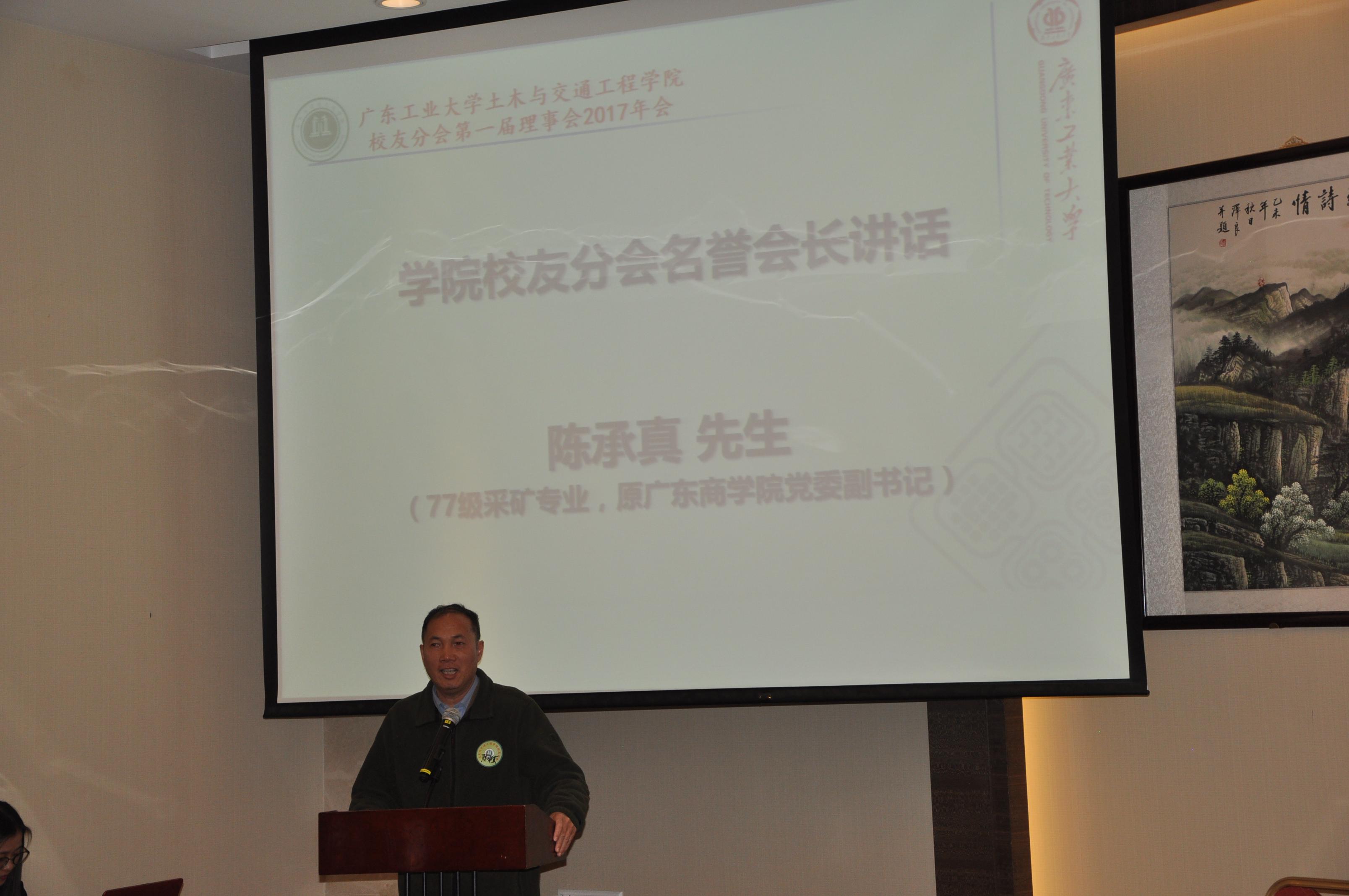 陈承真名誉会长讲话,他认为年会召开很好,校友们见面互相询叙旧;在感恩母校、思念同窗的同时,感叹学校高水平大学的建设进展和校友们的事业“接地气”,推动着国家经济的发展。