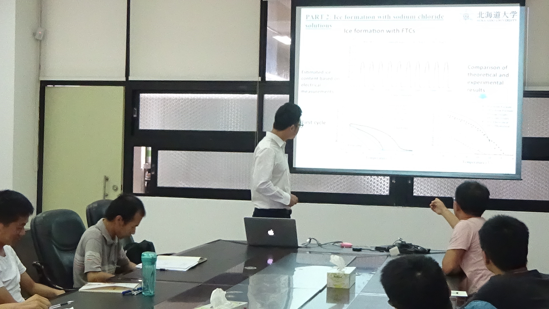 汪毅博士首先介绍了混凝土在北方圈寒冷地区由于冻融破坏给道路、桥梁和人行道所带来的影响和危害,目前解决混凝土冻融破坏的常见方法以及存在的不足,然后详细介绍了自己从细观角度出发探索水泥砂浆盐冻破坏机理,提出彻底解决北方圈混凝土盐冻问题的方法,并建立混凝土材料力学性能退化预测模型以及评估方法,理论模型与评估方法经过验证与实验结果具有较好的相吻度。讲座结束汪毅博士与现场师生进行了交流,就混凝土在极寒状态下的细微结构差异,水体结冰过程中盐溶变化,模型构建中参数的选取等问题等跟与会者进行了热烈讨论和交流。