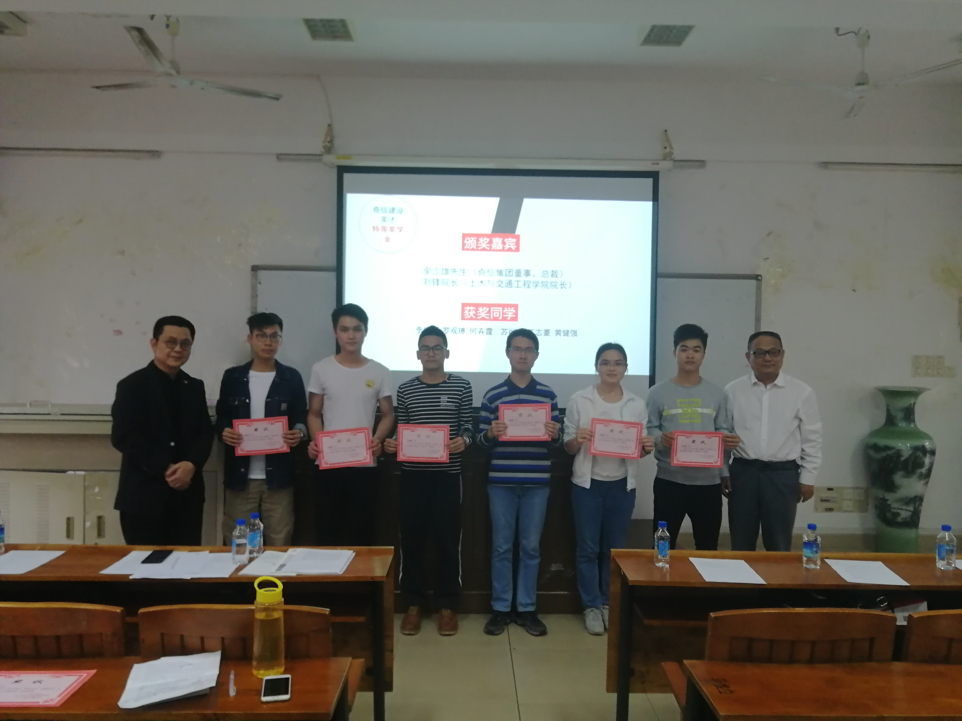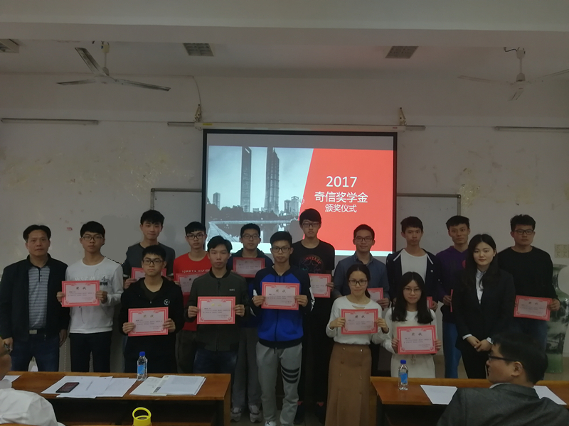 2018年3月14日下午,由深圳奇信建设集团股份有限公司赞助的“奇信奖学金”顺利地在实验二号楼520举行了颁奖仪式。深圳奇信股份董事、总裁余少雄先生、副总裁兼奇信惠州公司总经理谢辉先生、奇信智能化子公司副总经理肖汉先生、奇信总部人资中心张凌女士、奇信惠州公司办学主管邵幻女士,动漫狂