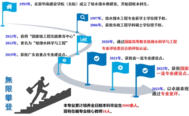 于1993年创办“给水排水工程”专业,是国内较早创办给排水专业的院校之一。经过30多年的建设,本专业于2005年已有市政工程硕士点,2012年获得了“国家级工程实践教育中心”与“广东省大学生实践教学基地”。本专业是广东省重点专业,承担着为广东省培养水务领域高素质人才的重任。2020年底,本专业通过住建部高等教育给排水科学与工程专业评估委员会的评估(认证)(广东省仅两家),标志着我校给排水科学与工程专业的建设迈上一个新台阶。2021年,本专业获批广东省一流专业建设点。2022年,本专业获批国家一流专业建设点。2023年,本专业以卓越表现通过住建部高等教育给排水科学与工程专业评估委员会的评估(认证)复评。2023年软科中国大学专业排名位列A层次。本专业在生源质量、师资结构、学科建设、培养体系、立德树人、教研成果和行业贡献等方面都具有独特优势,在国内同类学校中名列前茅。目前在校生300余人,90%的学生来自广东省。
