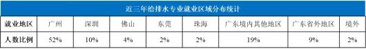 广东省的水务行业具有明显的地方特色。本专业的就业率连续3年达到100%,毕业生去向多元化,就业渠道和质量持续向好。毕业生主要分布在粤港澳大湾区中心城市,遍布政府部门、大型央企、国企、知名高校和科研机构,形成影响力巨大的优质校友资源。毕业生可就业于城市规划、建筑、市政及其它专业设计研究院,或在建设、水务、环保、城管、消防等行政管理部门,或在水务集团等公用事业单位等,还可就业于建筑工程公司、机电设备安装公司、节能环保公司、医院、学校和科研院所等单位。