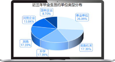 本学位点自授予以来,毕业40人,授予硕士学位40人,其中5人分别前往同济大学、中国科学院大学、中山大学、西安电子科技大学、华南农业大学继续攻读博士学位,其他35人就职于广州市城市规划勘测设计研究院、广州海洋地质调查局等企事业单位。从就业分布来看,大多数毕业生选择在广东省内发展,涵盖了事业单位、国有企业以及私营企业等多种类型。用人单位对本学位点的毕业生评价颇高,均已成为各自单位的核心力量。近三年的毕业生签约单位类型分布如下图(表格画成饼图)。