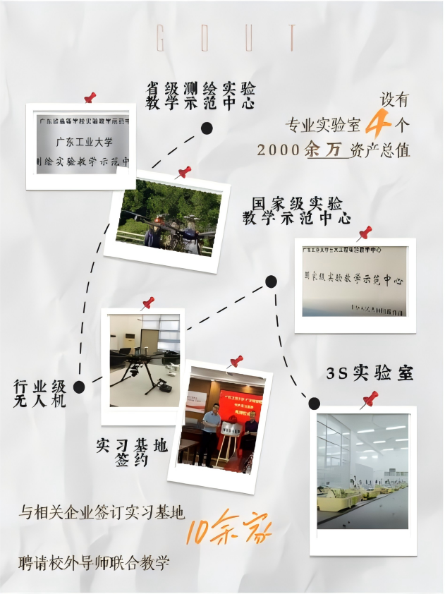 学位点设有广东省测绘实验教学示范中心、工程测量、控制测量、3S技术等相关专业实验室4个,各类测量实验仪器齐备,资产总值2000余万元。此外,在广州大学城建有5平方公里实习基地,与广东省多家知名生产单位共建实践基地。