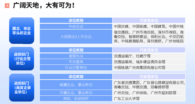 桥梁与隧道工程方向已为国家培养输送了大批优秀人才,他们活跃在工程设计院、科研院所、大型施工企业、政府部门等关键岗位,成为行业的技术骨干和管理精英,在大湾区超级工程、国家重大基础设施建设项目中发挥着重要作用。广工土木人的足迹,遍布祖国建设的壮丽画卷!