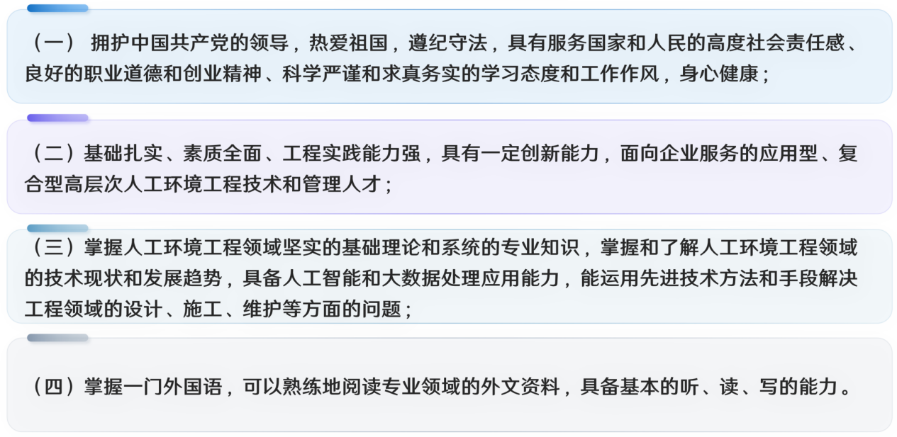 立足国家战略需求,面向粤港澳大湾区发展定位,培养具有良好的职业素养、能独立担负人工环境工程领域技术工作的应用型、复合型高层次工程技术和工程管理人才。具体要求为: